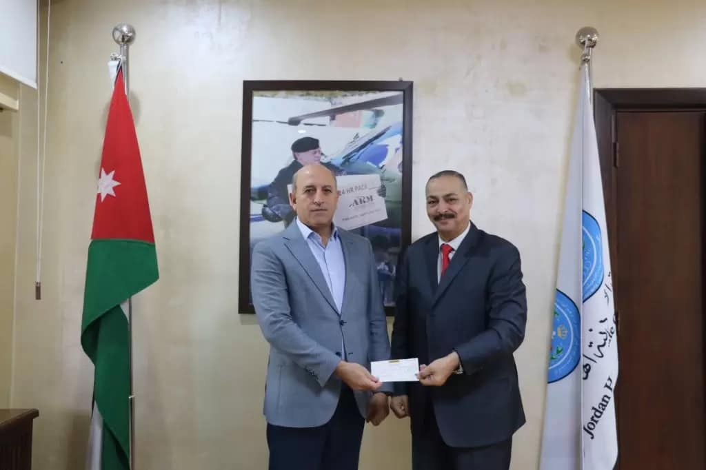 مندوبا عن رئيس الهيئة الادارية للاتحاد العام للجمعيات الخيرية الدكتور عاطف عضيبات سلم نائب الرئيس عياش كريشان شيك مبلغ العشرين ألف دينار لأمين عام الهيئة الخيرية الأردنية الهاشمية حسين الشبلي