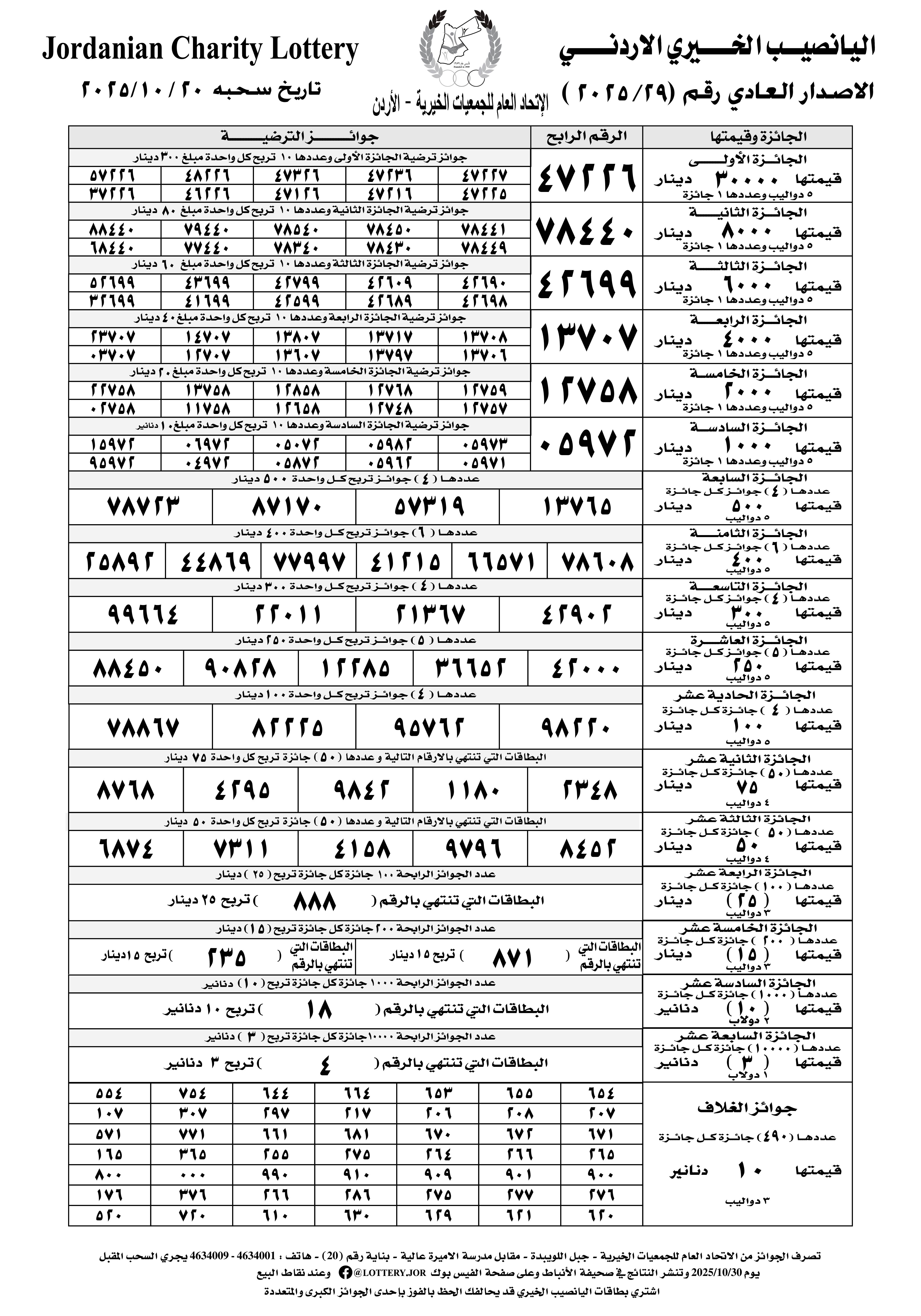 كشف نتائج سحب اليانصيب الخيري للإصدار العادي رقم 29-2025 تاريخ سحب 2025/10/20