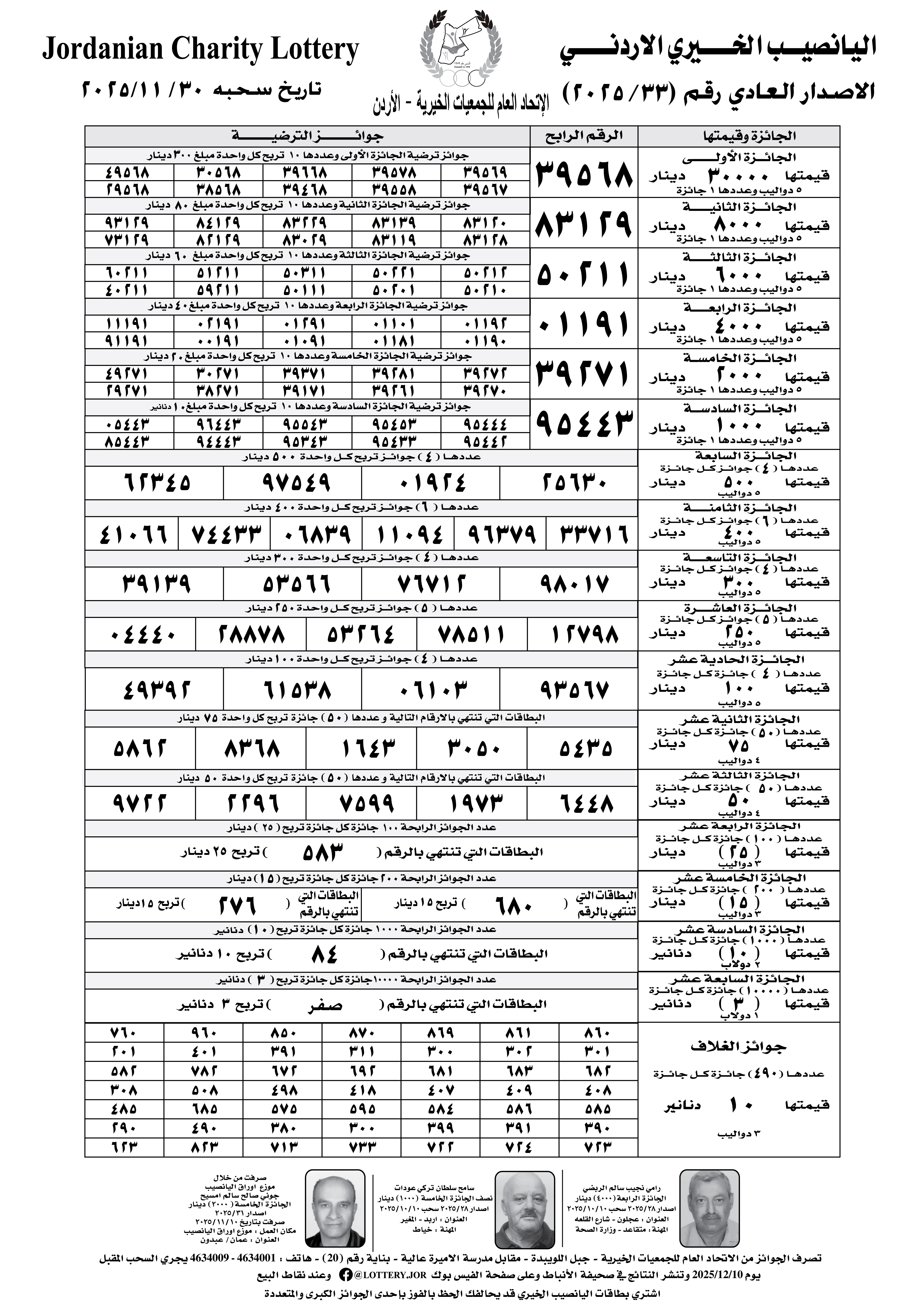 كشف نتائج سحب اليانصيب الخيري للإصدار العادي رقم 33-2025 تاريخ سحب 2025/11/30