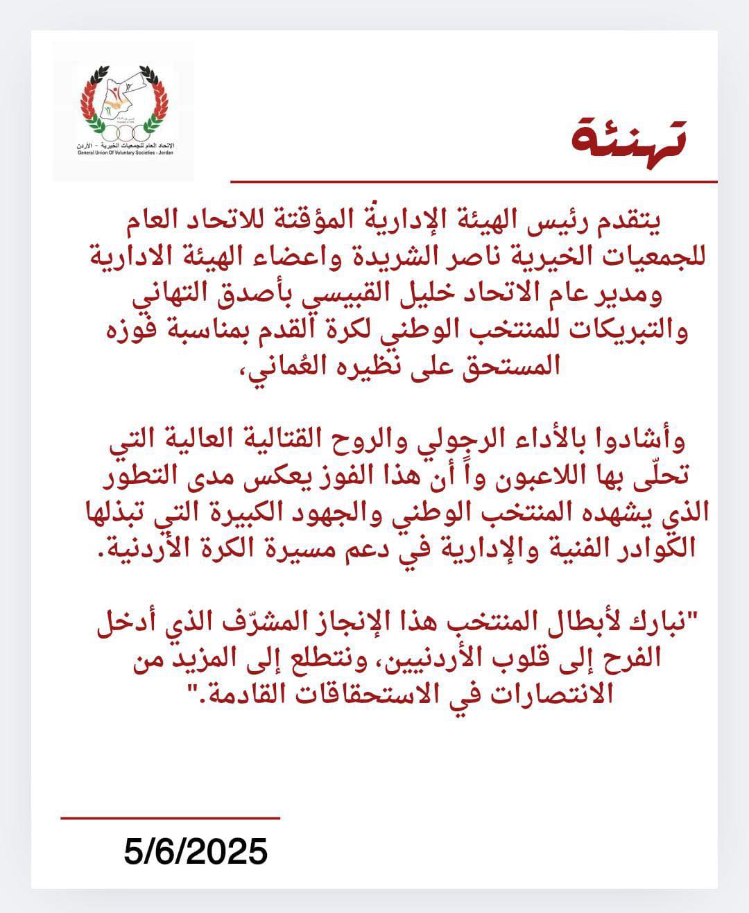 تهنئة بمناسبة فوز المنتخب الأردني