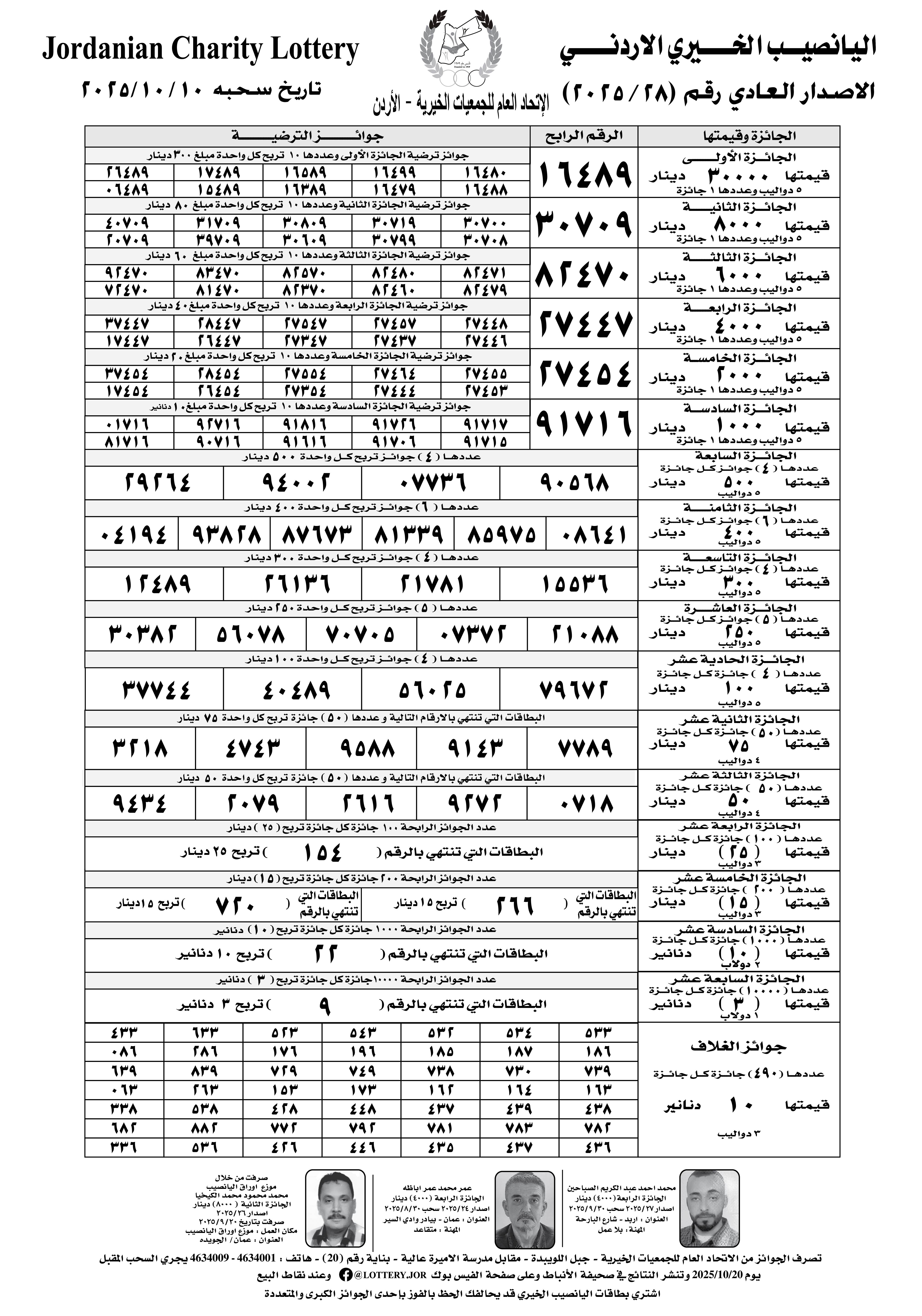 كشف نتائج سحب اليانصيب الخيري للإصدار العادي رقم 28-2025 تاريخ سحب 2025/10/10