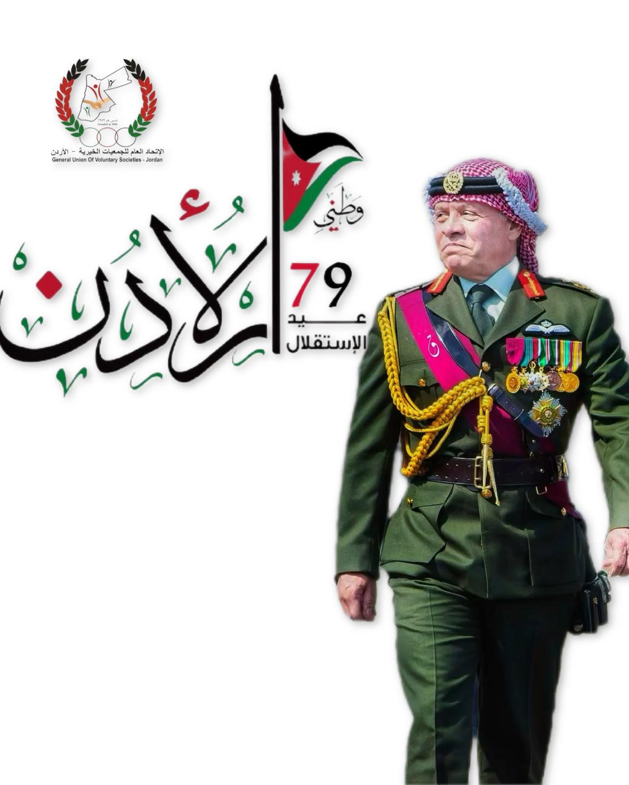بمناسبة الذكرى التاسعة والسبعين لاستقلال المملكة الأردنية الهاشمية، يتقدم الاتحاد العام للجمعيات الخيرية بأسمى آيات التهاني والتبريكات إلى مقام حضرة صاحب الجلالة الهاشمية الملك عبدالله الثاني ابن الحسين المعظم وولي عهدة الأمين سمو الأمير الحسين ابن عبدالله الثاني المعظم والعائله الهاشميه ، وإلى أبناء وبنات الوطن كافة، بهذه المناسبة الوطنية الخالدة التي تجسد محطة مضيئة في تاريخ الأردن ومسيرته المباركة نحو التقدم والازدهار.