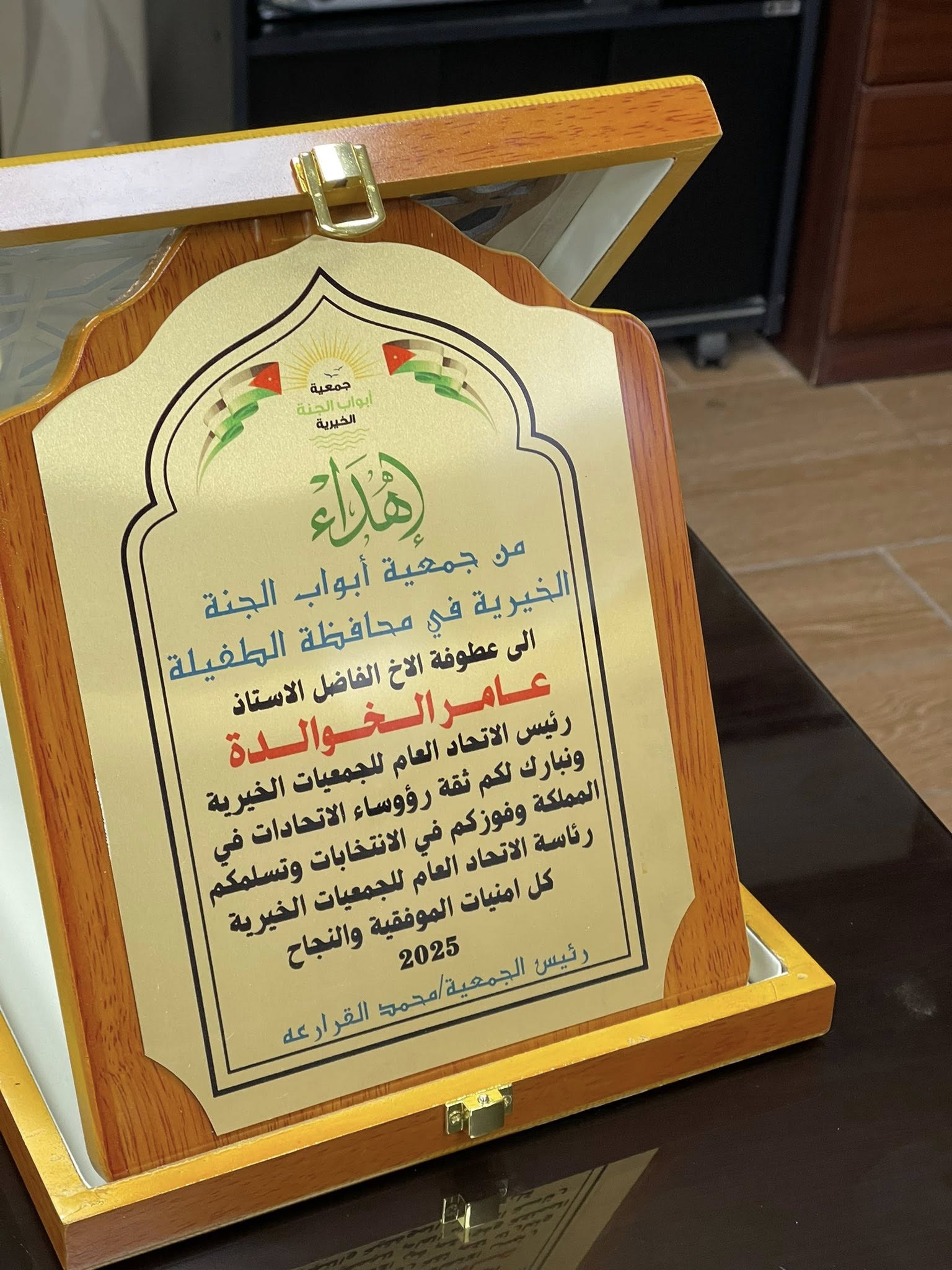 كرمت جمعية أبواب الجنه الخيريه في محافظة الطفيلة رئيس الاتحاد العام للجمعيات الخيرية عامر الخوالده بمناسبة فوزه برئاسة الاتحاد العام .