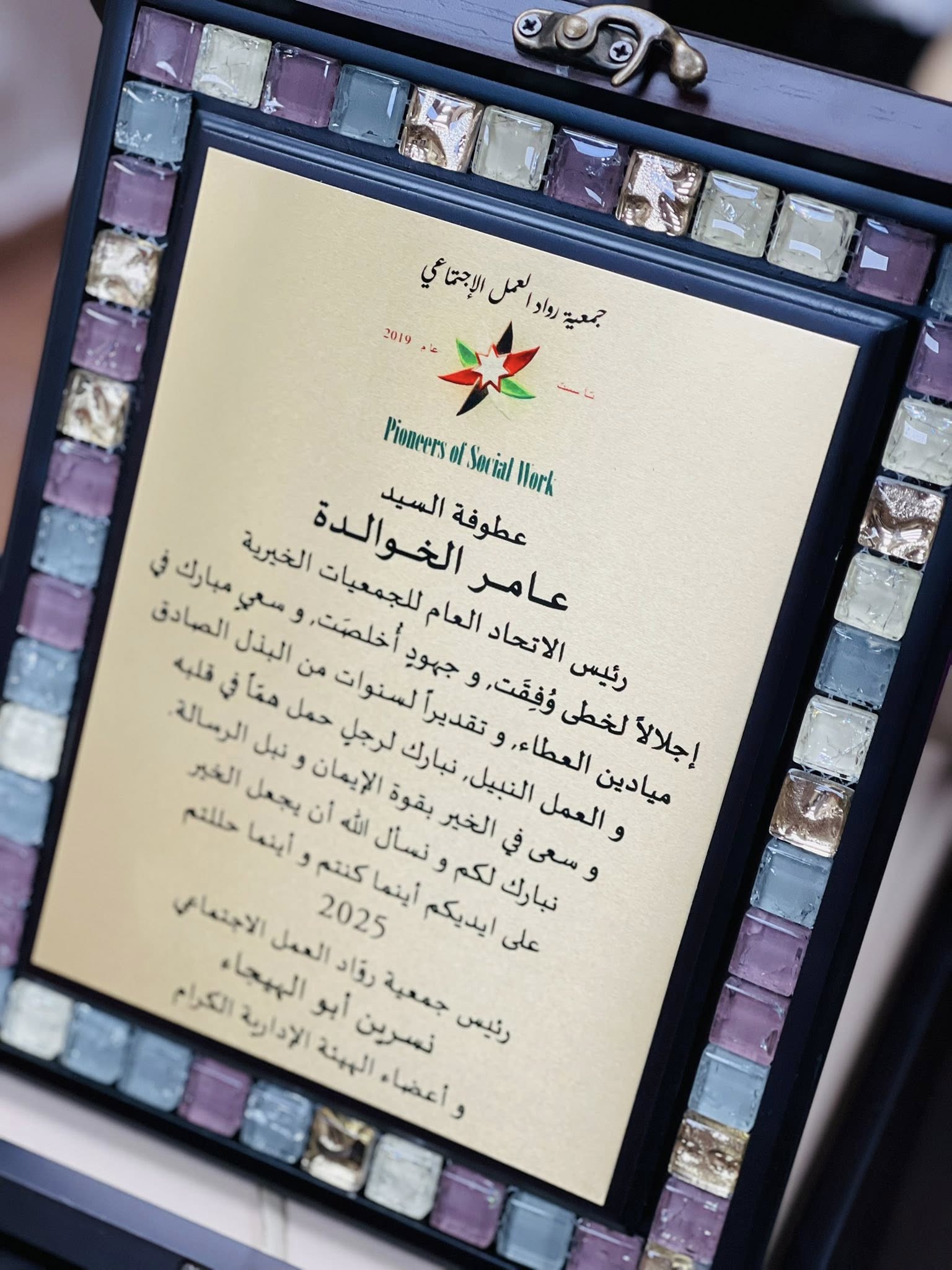 كرمت جمعية رواد العمل التطوعي رئيس الاتحاد العام للجمعيات الخيرية عامر الخوالده بمناسبة فوزه برئاسة الاتحاد العام بحضور نائب رئيس الاتحاد العام المحامي الدكتور بركات بركات.